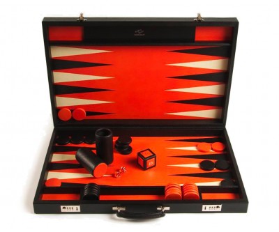 The ultimate in luxury play: Dauphin leather attache case with hand inlaid leather playing field. Handmade weighted leather stones/checkers designed with Backgammon Champion Paul Magriel. Feature an inlaid leather doubling cube, uncrushable dice cups with trips to prevent unfair play, ball cornered precision dice, solid brass combination locks, and a hand-stitched leather carrying handle. (Compact Travel size has standard dice and cubes and a “fishtail” handle; Hand size has standard dice and cubes and no handle). Nickel or gilt locks and handle plates are available.