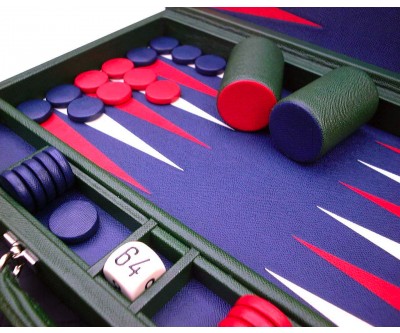 Dauphin leather frame with hand inlaid leather and finest quality Billiard Cloth (not felt) playing field. Acrylic stones/checkers, traditionally flat on one side, contemporary finger “dish” on the other. Giant deep etched acrylic Doubling Cube, uncrushable dice cups with trips to prevent unfair play, ball cornered precision dice (Competition and Tournament sizes only; standard in other sizes).