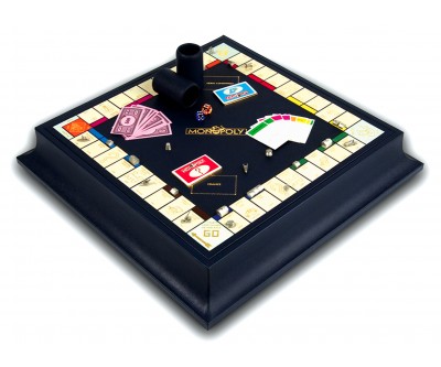 Inlaid leather Monopoly set atop a beautiful hand bound scalloped sided plinth in Dauphin calf. Embossed in either Gold or Silver each of the seventy inlays are meticulously prepared to give an almost seemless appearance. The playing board is available as standard in either UK or US editions (others by special order) pivots to reveal the stowage area within the plinth. Set out in black felt are the playing pieces (pewter, Sterling Silver or Silver-gilt), a pair of uncrushable leather dice cups complete with trips to prevent unfair play. Two ball cornered precision dice, leather-bound “Bank” boxes with “money” seperators and a leather rule envelope complete this magnificent piece. It is available with either U.K. or American streets.