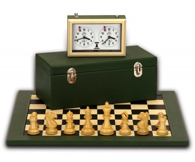 Pieces come in a felt lined leather cabinet, with a single thickness Chessboard.