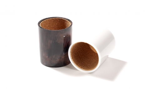 These cylindrical dice cups by American backgammon craftsmen Crisloid feature raised lips, which promote maximum pip spin for fair play. Cork-lined interior keeps play mum, while guaranteeing the cups are virtually crush-proof. Available in green and white, red and white, brown and white, blue and white, and black and white.