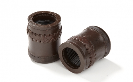 Luxurious leather-bound crush-proof dice cups with trips to prevent corrupt play. An official tournament dice cup that ensures thorough dice tumbling when rolling out of the cup. These hand sized cups fit comfortably in most backgammon boards and feature a hand made leather braid pattern.