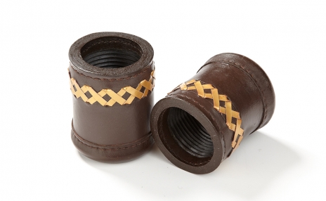 Luxurious leather-bound crush-proof dice cups with trips to prevent corrupt play. An official tournament dice cup that ensures thorough dice tumbling when rolling out of the cup. These hand sized cups fit comfortably in most backgammon boards and feature a contrasting gold stitching design on the exterior.