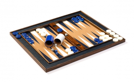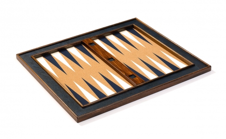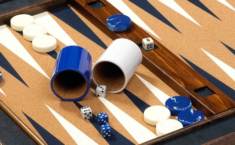 The experts' choice, Crisloid has provided elegance and reliability for generations of tournament heroes. This twenty-eight inch board boasts a precision-fitted cork playing surface, so your dice topple with whispered bounces and the polished marbleized acrylic stones glide true. The solid wood exterior maintains merit for countless seasons, whether you play with or against the grain. A cut wood pocket at the board's nucleus cradles the one-inch doubling cube. Equipped with cylindrical cork-lined dice cups featuring raised lips, promoting maximum pip spin for fair play. Fabricated in the U.S.A. and played around the world. Discover the range of recreation in rich royal blue. Savoir faire not included.