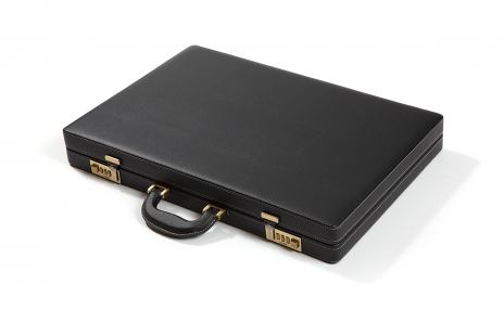 - Sturdy, double-stitched, metal hinged leatherette attache carrying case w/ rugged handles.