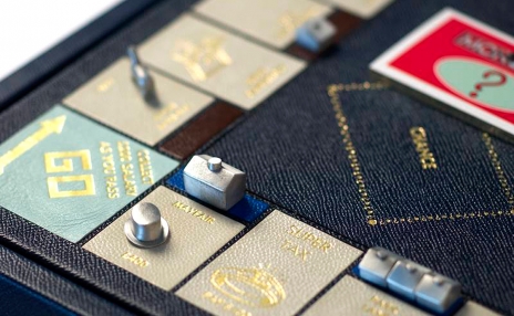 We are proud to offer the Monopoly set for true players, an elegant exclusive from Geoffrey Parker. This marvelous edition of "the most played commercial board game in the world" comes crafted for kings of real estate, boasting rich elements fit for any penthouse on Park Place. Features hand-bound Dauphin calfskin sides, meticulously detailed scalloped pinth, and each of the seventy inlays embossed in silver or gold. The board smoothly pivots to unveil a storage area beneath, where the game pieces nestle in soft, black felt. Game pieces are available in your choice of pewter, sterling silver, or silver-gilt. Two ball-cornered precision dice come complemented by a pair of nearly indestructible leather dice cups, outfitted with trips to assure fair play. Leather-bound bank boxes include a leather rule envelope and money separators for faux currency. Board offered in standard UK or US editions with regionally-corresponding streets, other editions available by special order.
