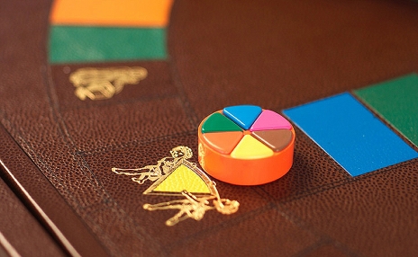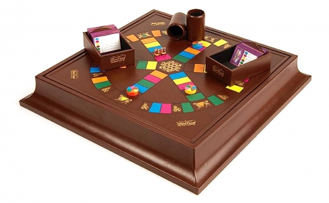 For Trivial Pursuit, the classic dinner-party trivia game with all the right questions, Geoffrey Parker provides the most elegant answer. Set on an inlaid calfskin board with luxuriously scalloped hand-inlaid plinth and embossed with silver or gold. Felt-lined storage compartments cushion the playing pieces, while leather-bound, crush-proof, trip-protected dice cups cradle two ball-cornered precision dice. Contain all the game's mysteries within the pair of calfskin-bound Question Card Boxes, outfitted with leather separators. Keep your opponents in line with the leather rules envelope. The standard acrylic "pies" and "segments," famously attributed to Trivial Pursuit, are also available inlaid with sterling silver for an extra elite touch.