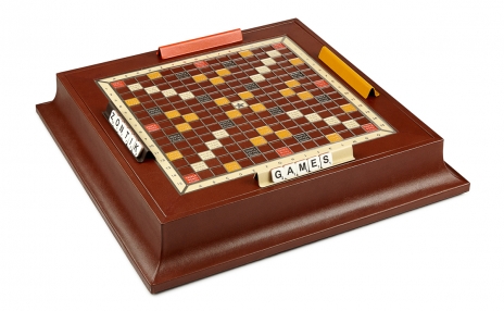 Luxury that goes way beyond words, every letter laid on this Scrabble set will feel like a triple-word score. Once again, Geoffrey Parker innovates with elegance that would translate to any language. This Dauphin-inlaid set features hand-bound scallop-sided plinth, both refined and regal. The board boasts silver or gold embossing under a nickel plated grid, so that syllables sparkle, whether you're throwing down "swank" or "sesquipedalian." Neatly stored beneath the board are four leather-bound letter racks, a felt drawstring bag, a booklet of rules, and the letters, made of buttery bridle-hide. The gameboard is revolutionary, mounted to a concealed Lazy Susan, allowing the playing surface to rotate freely with the tiles locked firmly into place.