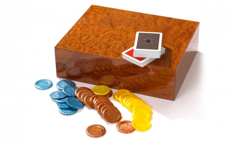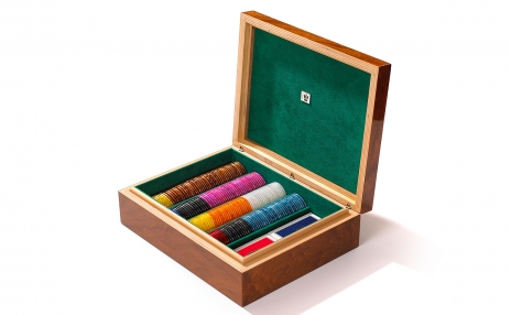 Sleek and discreet, this mahogany poker set from luxury game manufacturers Dal Negro is a must have for any connoisseur's catalog. Featuring a rich mahogany box set with silent hinges, the exterior alone is eye-catching. Open the case to reveal the classic, green fabric-lined interior, holding 200 European-style chips and two decks of cards. Gilded denominations are printed on the surface of each 44mm slick acrylic chip. The glossy mahogany exterior exudes distinction, with a reserved interior that is a perfect visual compliment. Case measures 30x23.5x8.5cm.